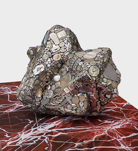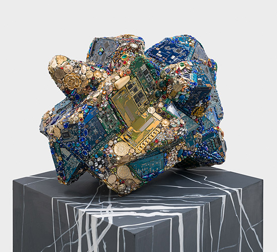 Las piezas aquí exhibidas recrean, a partir de desechos, las texturas de mármoles suntuosos y minerales exóticos. Así como los restos de caracoles y corales, sometidos durante milenios a presión y temperatura extremas, dieron origen al mármol, cabe preguntarse: ¿qué ocurrirá con nuestros basurales? ¿Se transformarán nuestros juguetes, envases y objetos cotidianos en un nuevo material multicolor que desconcierte a los geólogos del futuro?